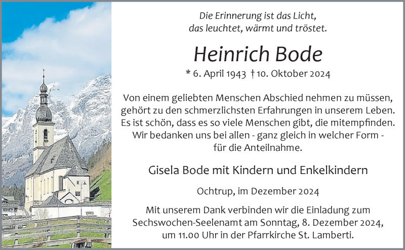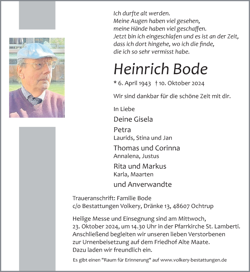 Hier finden Sie alle Traueranzeigen aus der Zeitung, die bisher für Heinrich Bode erschienen sind. Weitere Traueranzeigen, die in der Zeitung erscheinen, werden hier ebenfalls aufgelistet