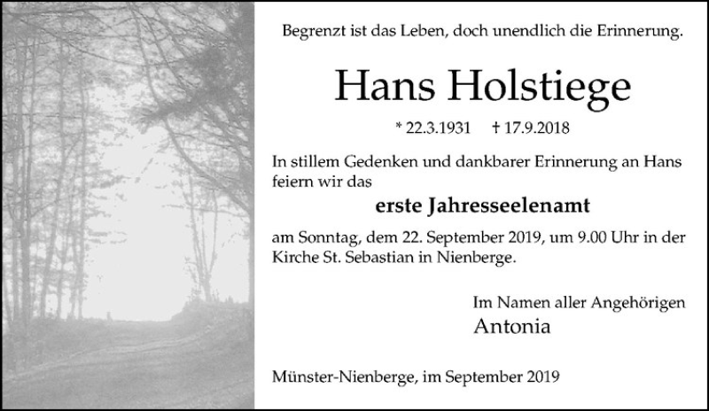 Hier finden Sie alle Traueranzeigen aus der Zeitung, die bisher für Hans Holstiege erschienen sind. Weitere Traueranzeigen, die in der Zeitung erscheinen, werden hier ebenfalls aufgelistet