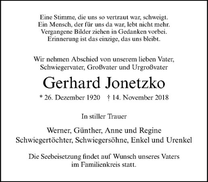 Hier finden Sie alle Traueranzeigen aus der Zeitung, die bisher für Gerhard Jonetzko erschienen sind. Weitere Traueranzeigen, die in der Zeitung erscheinen, werden hier ebenfalls aufgelistet