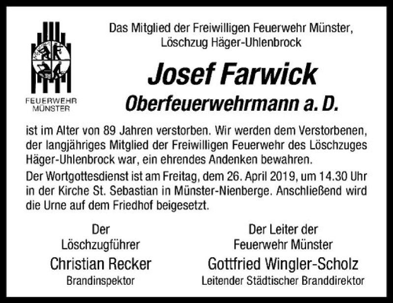Hier finden Sie alle Traueranzeigen aus der Zeitung, die bisher für Josef Farwick erschienen sind. Weitere Traueranzeigen, die in der Zeitung erscheinen, werden hier ebenfalls aufgelistet