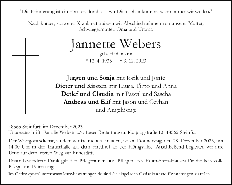 Hier finden Sie alle Traueranzeigen aus der Zeitung, die bisher für Jannette Webers erschienen sind. Weitere Traueranzeigen, die in der Zeitung erscheinen, werden hier ebenfalls aufgelistet