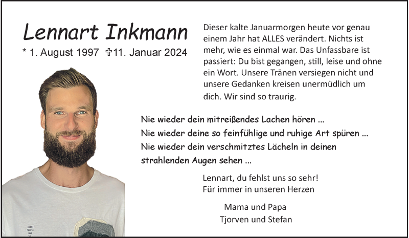 Hier finden Sie alle Traueranzeigen aus der Zeitung, die bisher für Lennart Inkmann erschienen sind. Weitere Traueranzeigen, die in der Zeitung erscheinen, werden hier ebenfalls aufgelistet
