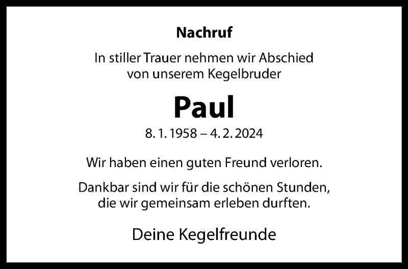 Hier finden Sie alle Traueranzeigen aus der Zeitung, die bisher für Paul erschienen sind. Weitere Traueranzeigen, die in der Zeitung erscheinen, werden hier ebenfalls aufgelistet