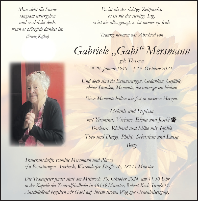 Hier finden Sie alle Traueranzeigen aus der Zeitung, die bisher für Gabriele Mersmann erschienen sind. Weitere Traueranzeigen, die in der Zeitung erscheinen, werden hier ebenfalls aufgelistet