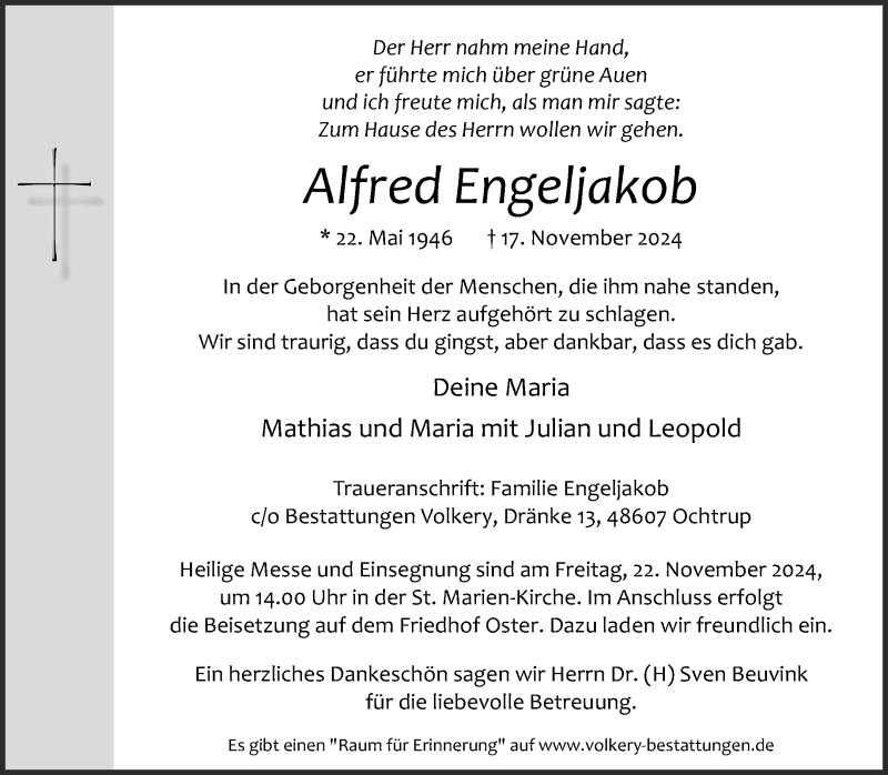 Hier finden Sie alle Traueranzeigen aus der Zeitung, die bisher für Alfred Engeljakob erschienen sind. Weitere Traueranzeigen, die in der Zeitung erscheinen, werden hier ebenfalls aufgelistet