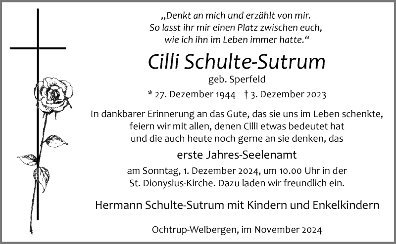 Hier finden Sie alle Traueranzeigen aus der Zeitung, die bisher für Cilli Schulte-Sutrum (geb. Sperfeld) erschienen sind. Weitere Traueranzeigen, die in der Zeitung erscheinen, werden hier ebenfalls aufgelistet