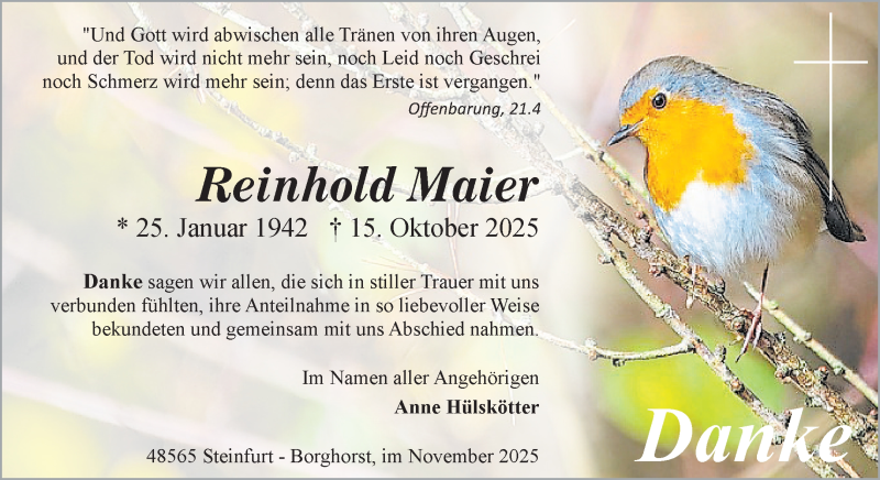 Hier finden Sie alle Traueranzeigen aus der Zeitung, die bisher für Reinhold Maier erschienen sind. Weitere Traueranzeigen, die in der Zeitung erscheinen, werden hier ebenfalls aufgelistet