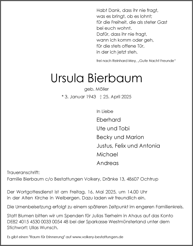 Hier finden Sie alle Traueranzeigen aus der Zeitung, die bisher für Ursula Bierbaum (geb. Möller) erschienen sind. Weitere Traueranzeigen, die in der Zeitung erscheinen, werden hier ebenfalls aufgelistet
