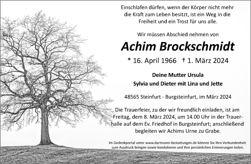 Hier finden Sie alle Traueranzeigen aus der Zeitung, die bisher für Achim Brockschmidt erschienen sind. Weitere Traueranzeigen, die in der Zeitung erscheinen, werden hier ebenfalls aufgelistet