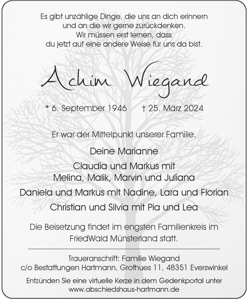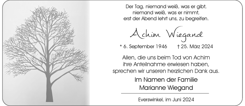 Hier finden Sie alle Traueranzeigen aus der Zeitung, die bisher für Achim Wiegand erschienen sind. Weitere Traueranzeigen, die in der Zeitung erscheinen, werden hier ebenfalls aufgelistet