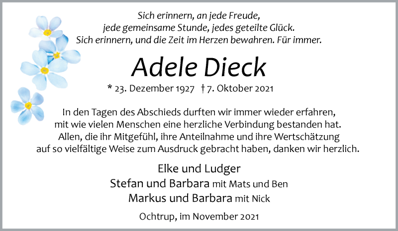 Hier finden Sie alle Traueranzeigen aus der Zeitung, die bisher für Adele Dieck erschienen sind. Weitere Traueranzeigen, die in der Zeitung erscheinen, werden hier ebenfalls aufgelistet