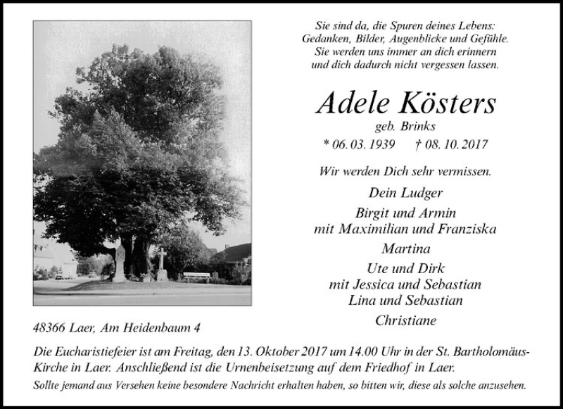 Hier finden Sie alle Traueranzeigen aus der Zeitung, die bisher für Adele Kösters erschienen sind. Weitere Traueranzeigen, die in der Zeitung erscheinen, werden hier ebenfalls aufgelistet