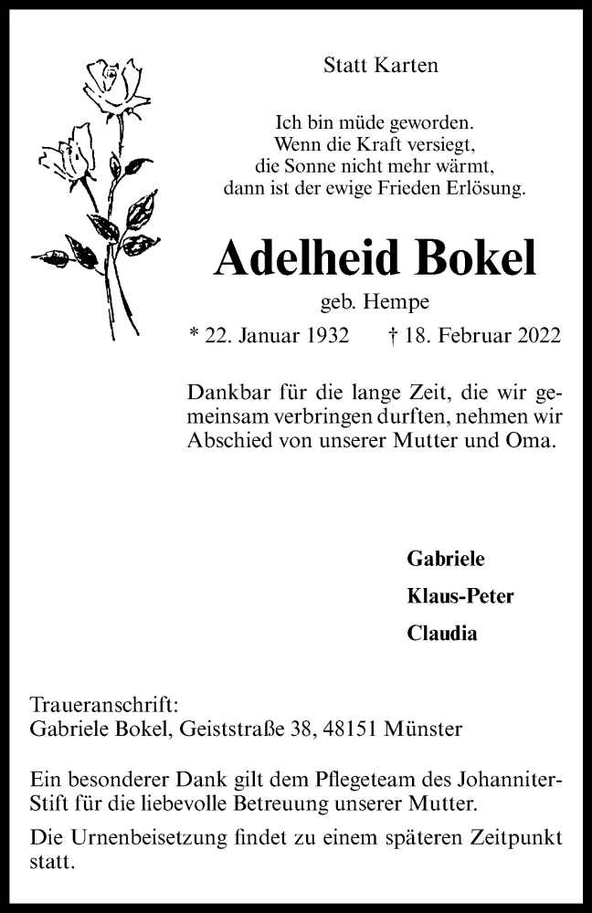 Hier finden Sie alle Traueranzeigen aus der Zeitung, die bisher für Adelheid Bokel erschienen sind. Weitere Traueranzeigen, die in der Zeitung erscheinen, werden hier ebenfalls aufgelistet