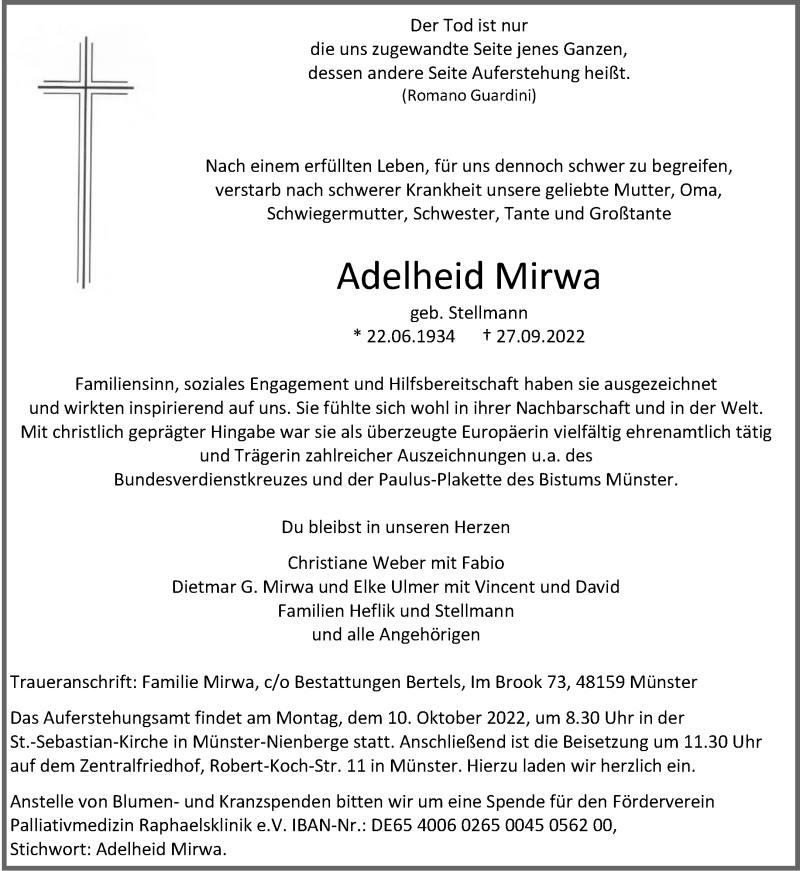 Hier finden Sie alle Traueranzeigen aus der Zeitung, die bisher für Adelheid Mirwa erschienen sind. Weitere Traueranzeigen, die in der Zeitung erscheinen, werden hier ebenfalls aufgelistet