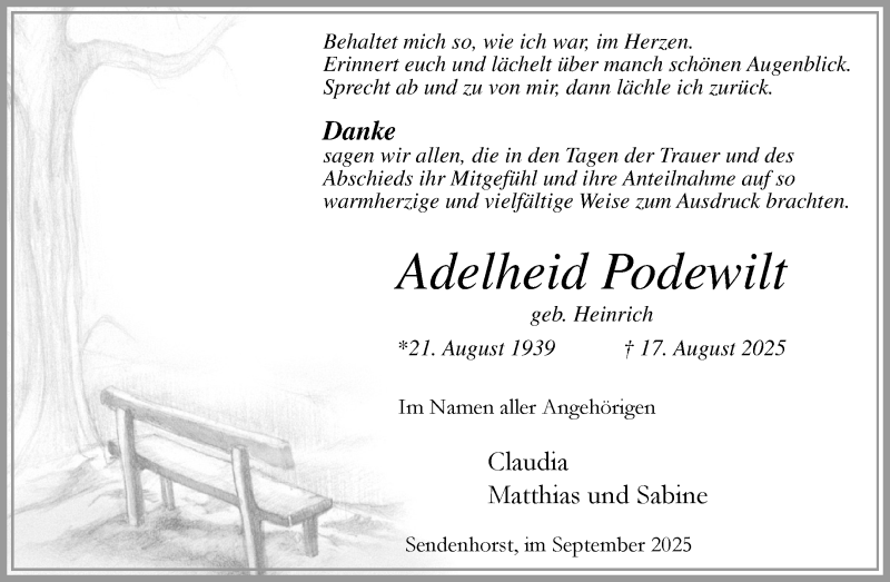 Hier finden Sie alle Traueranzeigen aus der Zeitung, die bisher für Adelheid Podewilt erschienen sind. Weitere Traueranzeigen, die in der Zeitung erscheinen, werden hier ebenfalls aufgelistet