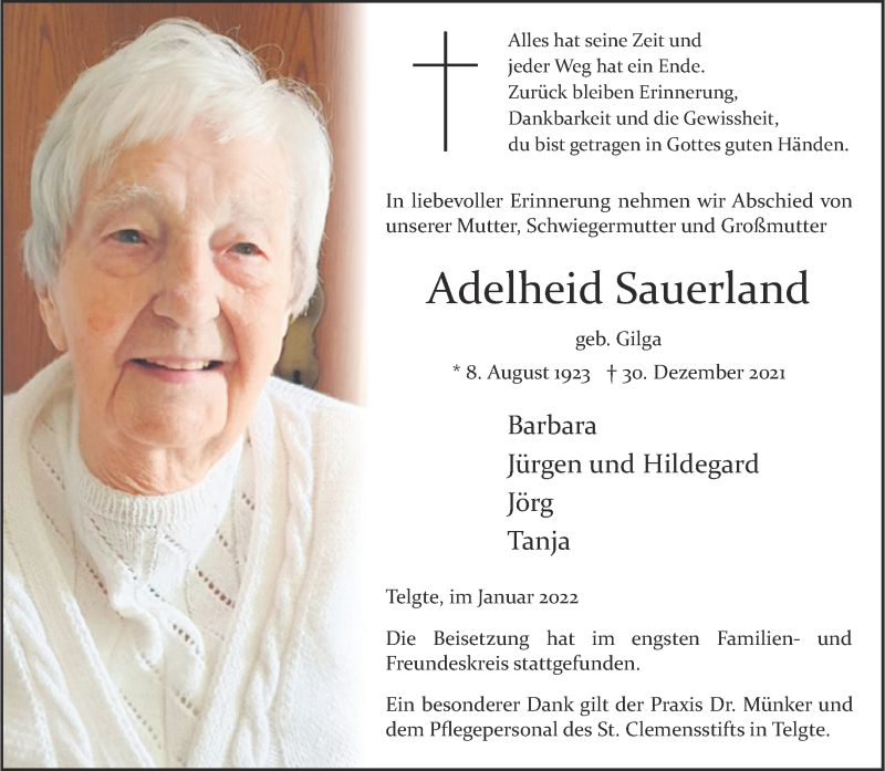 Hier finden Sie alle Traueranzeigen aus der Zeitung, die bisher für Adelheid Sauerland erschienen sind. Weitere Traueranzeigen, die in der Zeitung erscheinen, werden hier ebenfalls aufgelistet