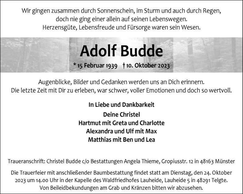 Hier finden Sie alle Traueranzeigen aus der Zeitung, die bisher für Adolf Budde erschienen sind. Weitere Traueranzeigen, die in der Zeitung erscheinen, werden hier ebenfalls aufgelistet