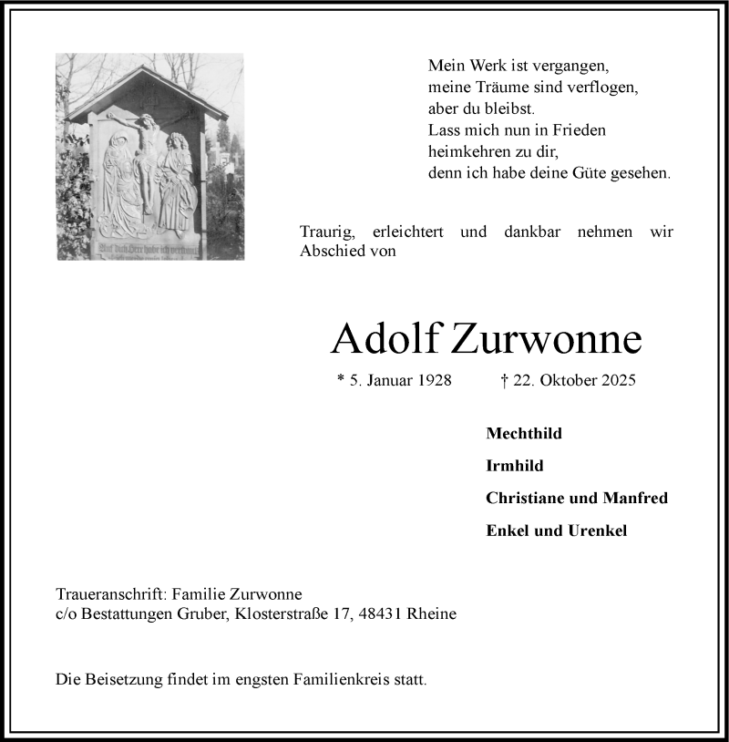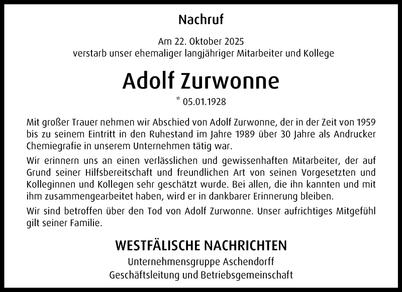 Hier finden Sie alle Traueranzeigen aus der Zeitung, die bisher für Adolf Zurwonne erschienen sind. Weitere Traueranzeigen, die in der Zeitung erscheinen, werden hier ebenfalls aufgelistet