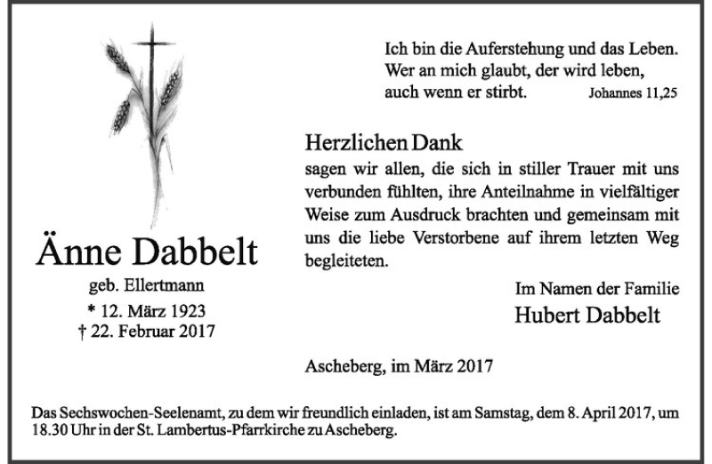 Hier finden Sie alle Traueranzeigen aus der Zeitung, die bisher für Änne Dabbelt erschienen sind. Weitere Traueranzeigen, die in der Zeitung erscheinen, werden hier ebenfalls aufgelistet