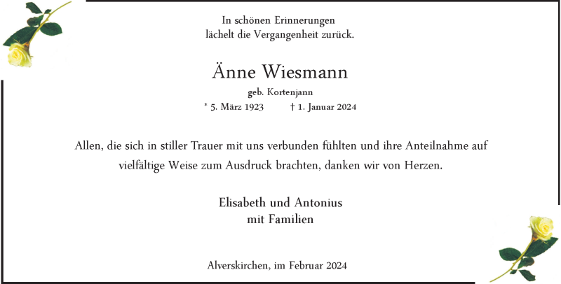 Hier finden Sie alle Traueranzeigen aus der Zeitung, die bisher für Änne Wiesmann erschienen sind. Weitere Traueranzeigen, die in der Zeitung erscheinen, werden hier ebenfalls aufgelistet