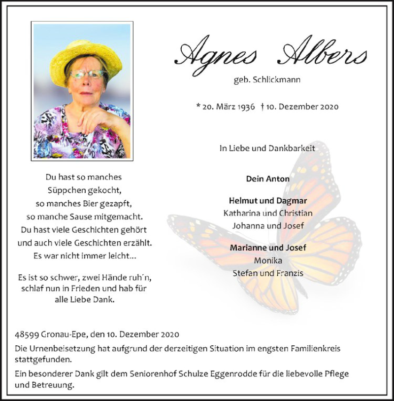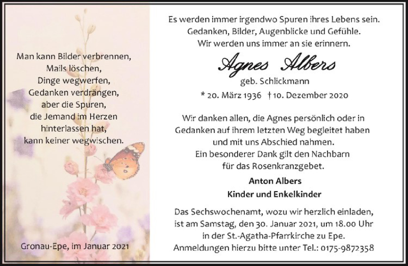 Hier finden Sie alle Traueranzeigen aus der Zeitung, die bisher für Agnes Albers erschienen sind. Weitere Traueranzeigen, die in der Zeitung erscheinen, werden hier ebenfalls aufgelistet