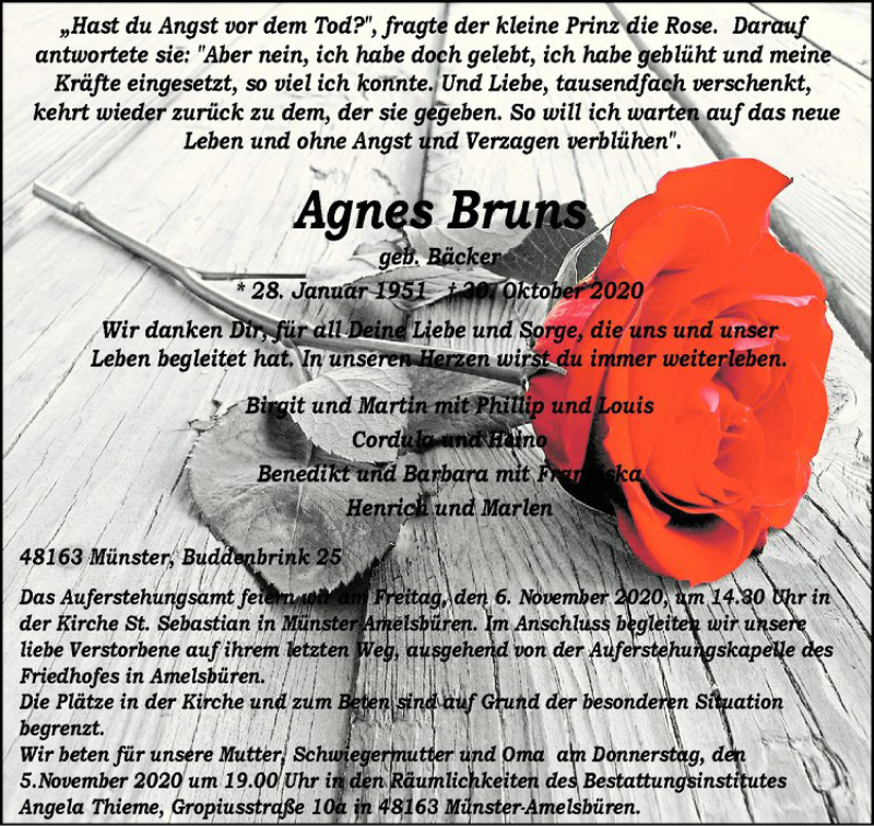 Hier finden Sie alle Traueranzeigen aus der Zeitung, die bisher für Agnes Bruns erschienen sind. Weitere Traueranzeigen, die in der Zeitung erscheinen, werden hier ebenfalls aufgelistet