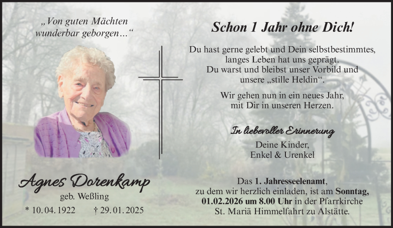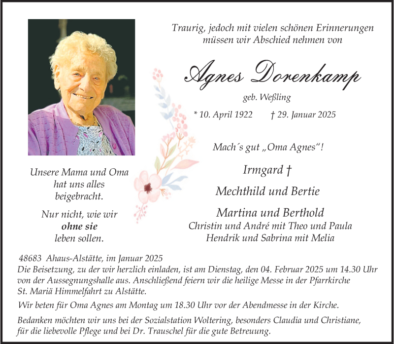 Hier finden Sie alle Traueranzeigen aus der Zeitung, die bisher für Agnes Dorenkamp erschienen sind. Weitere Traueranzeigen, die in der Zeitung erscheinen, werden hier ebenfalls aufgelistet