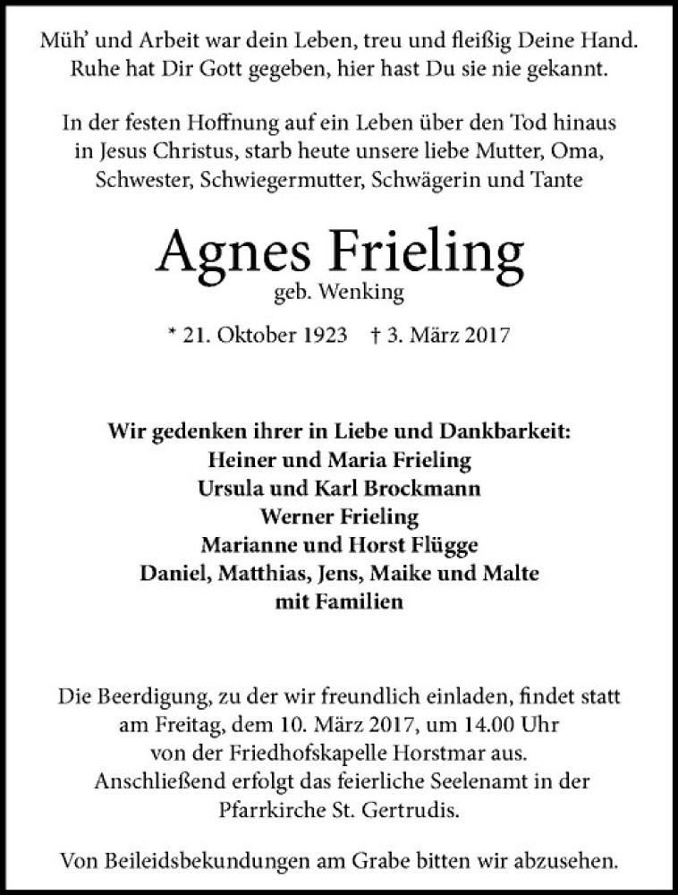 Hier finden Sie alle Traueranzeigen aus der Zeitung, die bisher für Agnes Frieling erschienen sind. Weitere Traueranzeigen, die in der Zeitung erscheinen, werden hier ebenfalls aufgelistet
