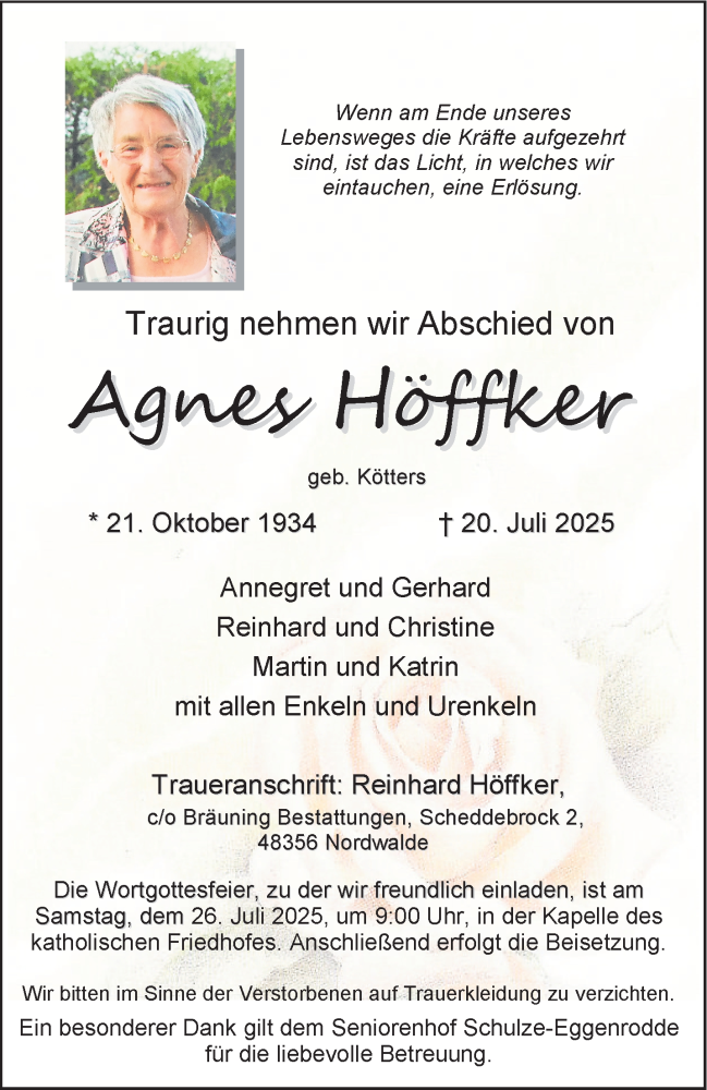 Hier finden Sie alle Traueranzeigen aus der Zeitung, die bisher für Agnes Höffker erschienen sind. Weitere Traueranzeigen, die in der Zeitung erscheinen, werden hier ebenfalls aufgelistet