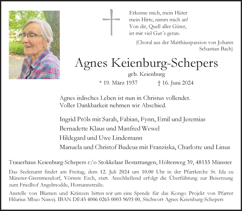 Hier finden Sie alle Traueranzeigen aus der Zeitung, die bisher für Agnes Keienburg-Schepers erschienen sind. Weitere Traueranzeigen, die in der Zeitung erscheinen, werden hier ebenfalls aufgelistet