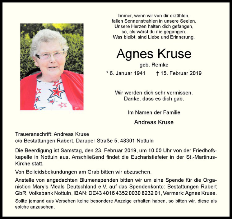 Hier finden Sie alle Traueranzeigen aus der Zeitung, die bisher für Agnes Kruse erschienen sind. Weitere Traueranzeigen, die in der Zeitung erscheinen, werden hier ebenfalls aufgelistet