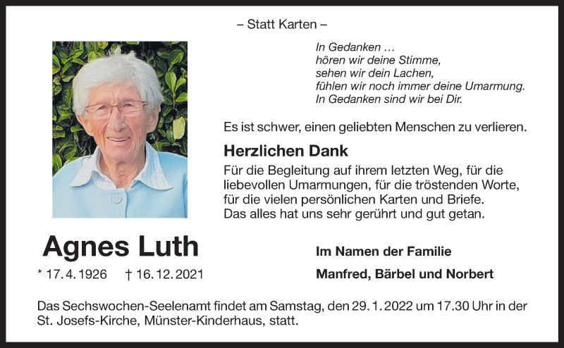 Hier finden Sie alle Traueranzeigen aus der Zeitung, die bisher für Agnes Luth erschienen sind. Weitere Traueranzeigen, die in der Zeitung erscheinen, werden hier ebenfalls aufgelistet