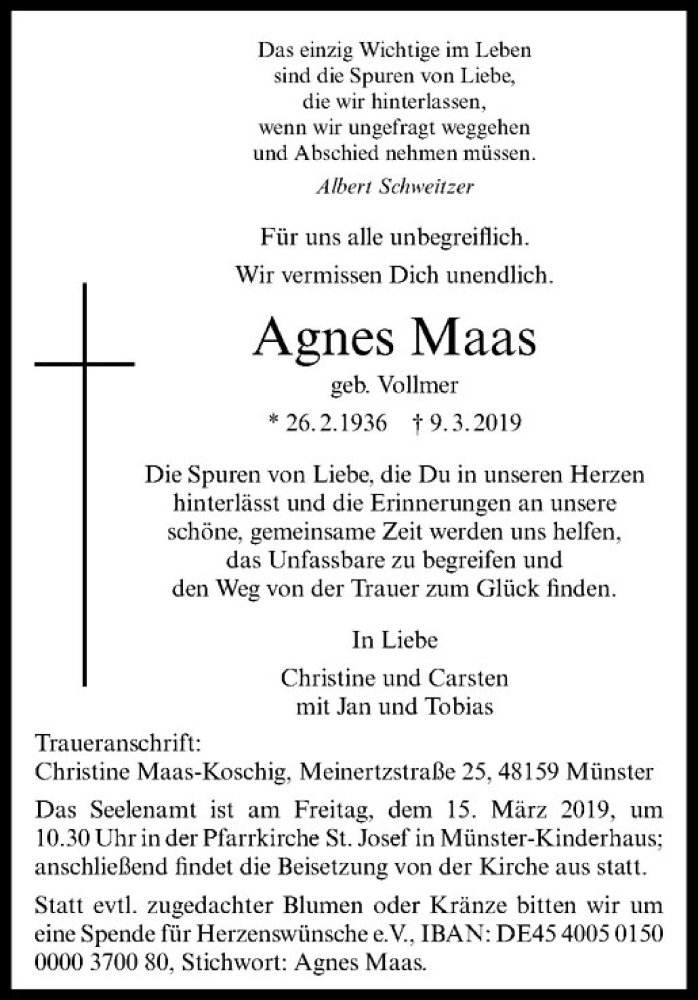 Hier finden Sie alle Traueranzeigen aus der Zeitung, die bisher für Agnes Maas erschienen sind. Weitere Traueranzeigen, die in der Zeitung erscheinen, werden hier ebenfalls aufgelistet