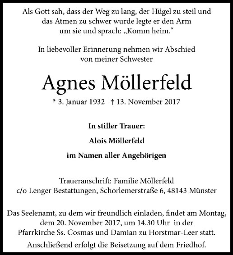 Hier finden Sie alle Traueranzeigen aus der Zeitung, die bisher für Agnes Möllerfeld erschienen sind. Weitere Traueranzeigen, die in der Zeitung erscheinen, werden hier ebenfalls aufgelistet