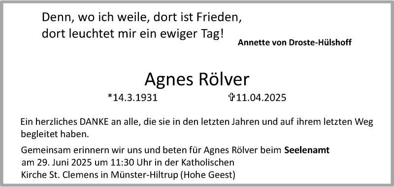 Hier finden Sie alle Traueranzeigen aus der Zeitung, die bisher für Agnes Rölver erschienen sind. Weitere Traueranzeigen, die in der Zeitung erscheinen, werden hier ebenfalls aufgelistet