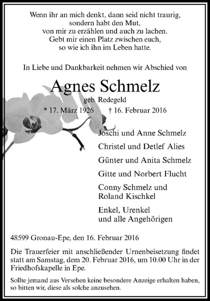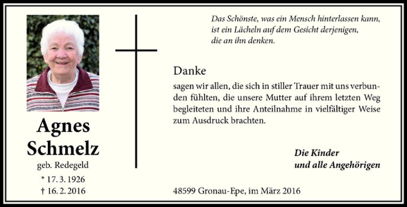 Hier finden Sie alle Traueranzeigen aus der Zeitung, die bisher für Agnes Schmelz erschienen sind. Weitere Traueranzeigen, die in der Zeitung erscheinen, werden hier ebenfalls aufgelistet