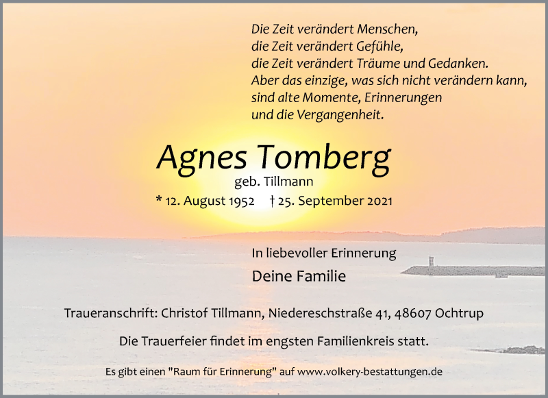 Hier finden Sie alle Traueranzeigen aus der Zeitung, die bisher für Agnes Tomberg erschienen sind. Weitere Traueranzeigen, die in der Zeitung erscheinen, werden hier ebenfalls aufgelistet