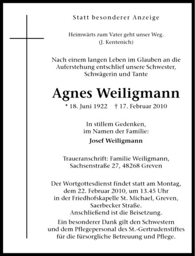 Hier finden Sie alle Traueranzeigen aus der Zeitung, die bisher für Agnes Weiligmann erschienen sind. Weitere Traueranzeigen, die in der Zeitung erscheinen, werden hier ebenfalls aufgelistet