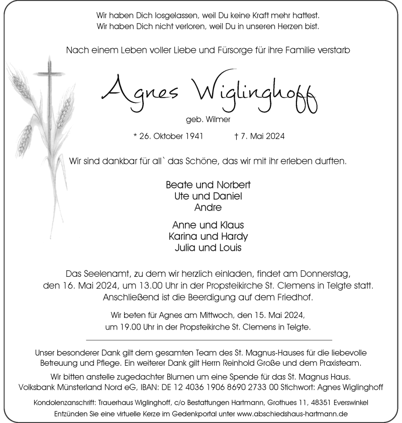 Hier finden Sie alle Traueranzeigen aus der Zeitung, die bisher für Agnes Wiglinghoff erschienen sind. Weitere Traueranzeigen, die in der Zeitung erscheinen, werden hier ebenfalls aufgelistet