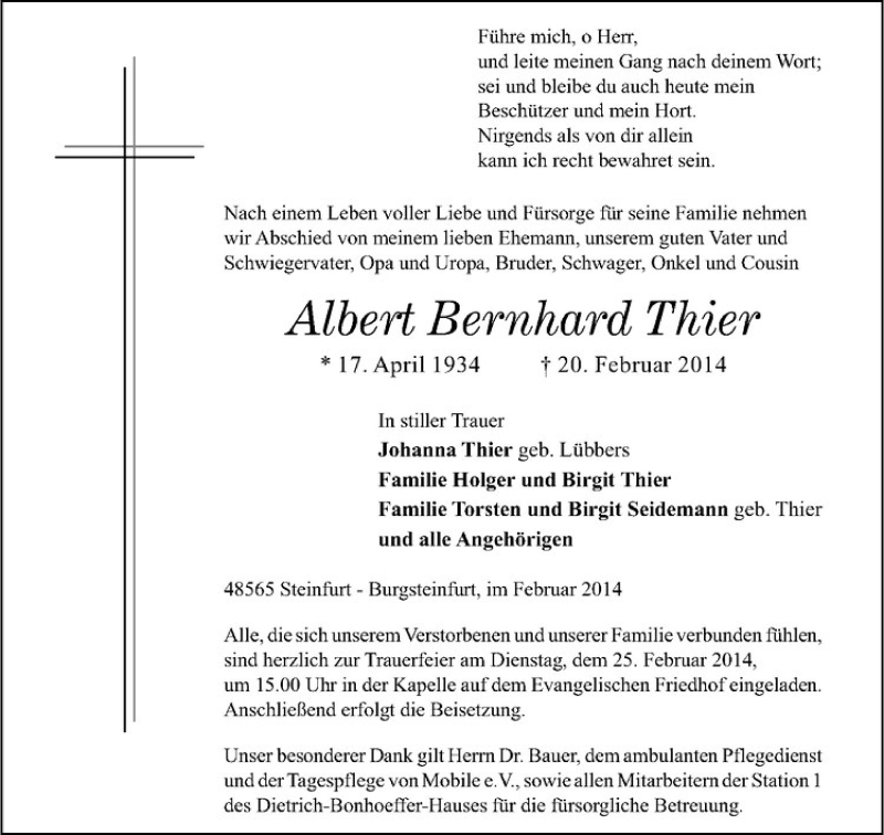 Hier finden Sie alle Traueranzeigen aus der Zeitung, die bisher für Albert Bernhard Thier erschienen sind. Weitere Traueranzeigen, die in der Zeitung erscheinen, werden hier ebenfalls aufgelistet