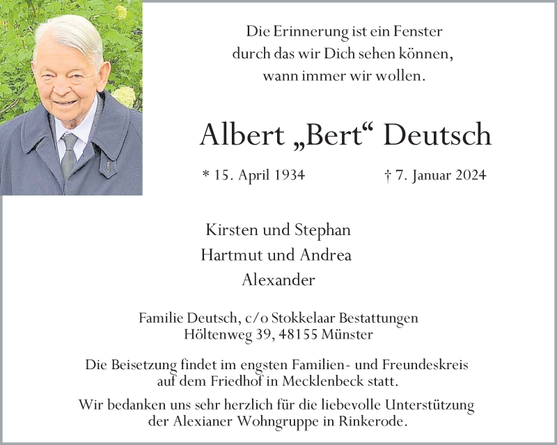 Hier finden Sie alle Traueranzeigen aus der Zeitung, die bisher für Albert Deutsch erschienen sind. Weitere Traueranzeigen, die in der Zeitung erscheinen, werden hier ebenfalls aufgelistet