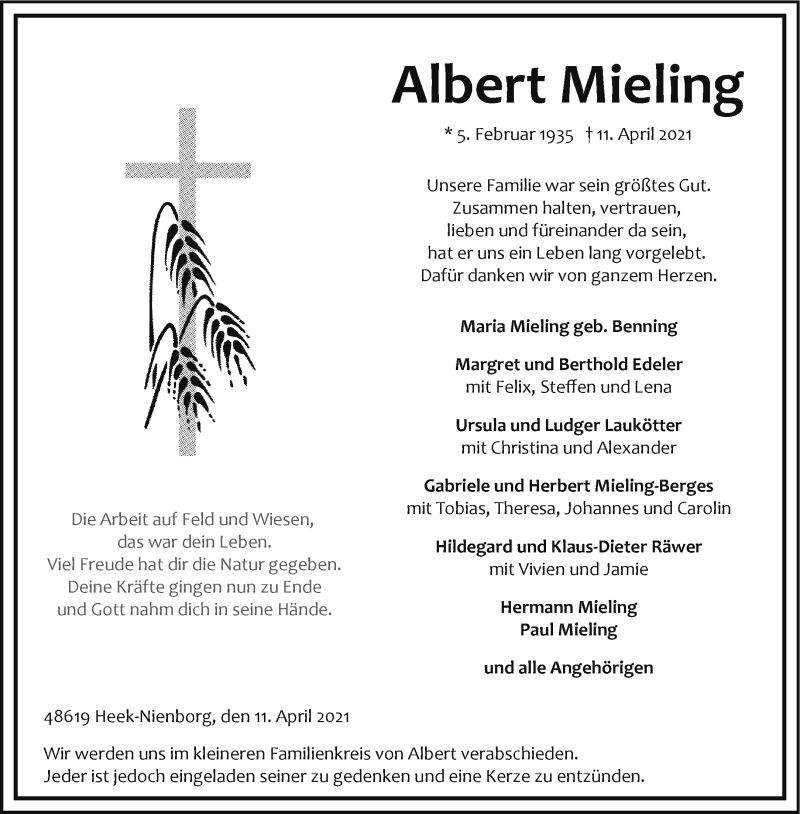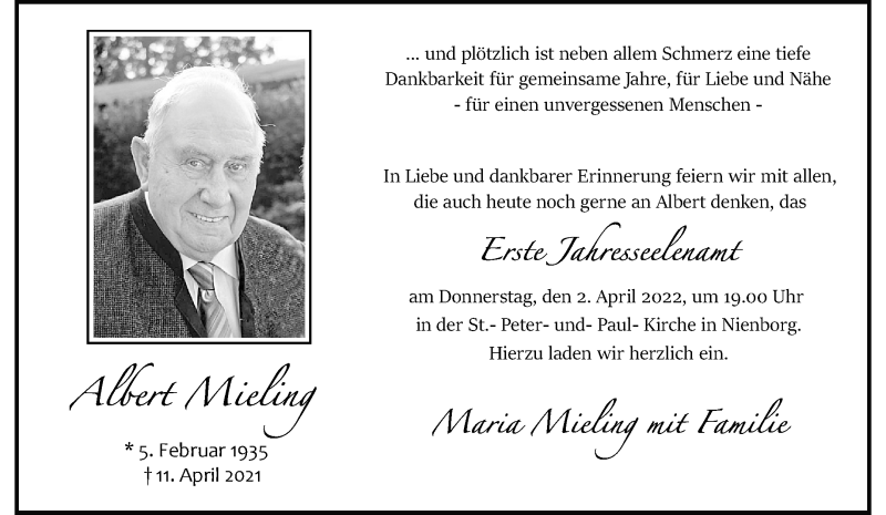 Hier finden Sie alle Traueranzeigen aus der Zeitung, die bisher für Albert Mieling erschienen sind. Weitere Traueranzeigen, die in der Zeitung erscheinen, werden hier ebenfalls aufgelistet