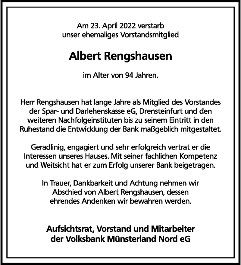 Hier finden Sie alle Traueranzeigen aus der Zeitung, die bisher für Albert Rengshausen erschienen sind. Weitere Traueranzeigen, die in der Zeitung erscheinen, werden hier ebenfalls aufgelistet