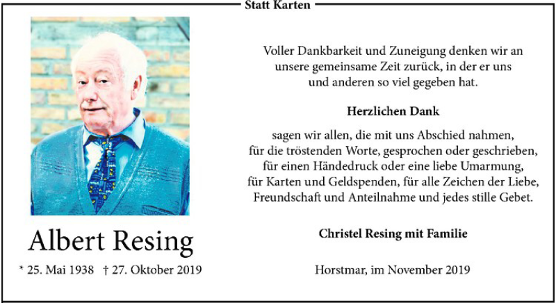 Hier finden Sie alle Traueranzeigen aus der Zeitung, die bisher für Albert Resing erschienen sind. Weitere Traueranzeigen, die in der Zeitung erscheinen, werden hier ebenfalls aufgelistet