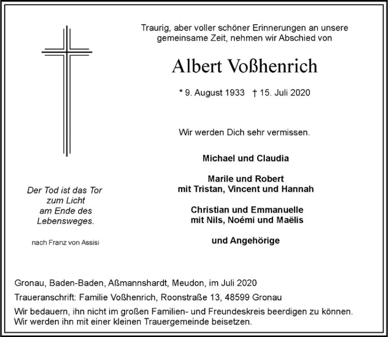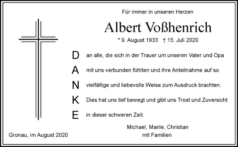 Hier finden Sie alle Traueranzeigen aus der Zeitung, die bisher für Albert Voßhenrich erschienen sind. Weitere Traueranzeigen, die in der Zeitung erscheinen, werden hier ebenfalls aufgelistet