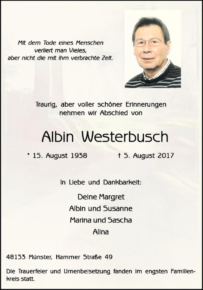 Hier finden Sie alle Traueranzeigen aus der Zeitung, die bisher für Albin Westerbusch erschienen sind. Weitere Traueranzeigen, die in der Zeitung erscheinen, werden hier ebenfalls aufgelistet