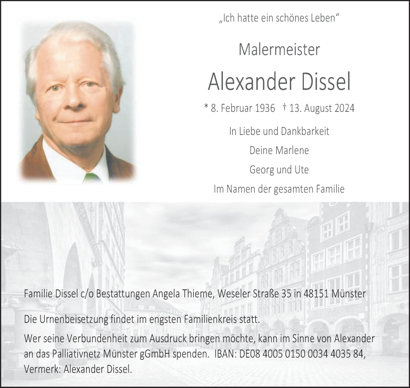 Hier finden Sie alle Traueranzeigen aus der Zeitung, die bisher für Alexander Dissel erschienen sind. Weitere Traueranzeigen, die in der Zeitung erscheinen, werden hier ebenfalls aufgelistet