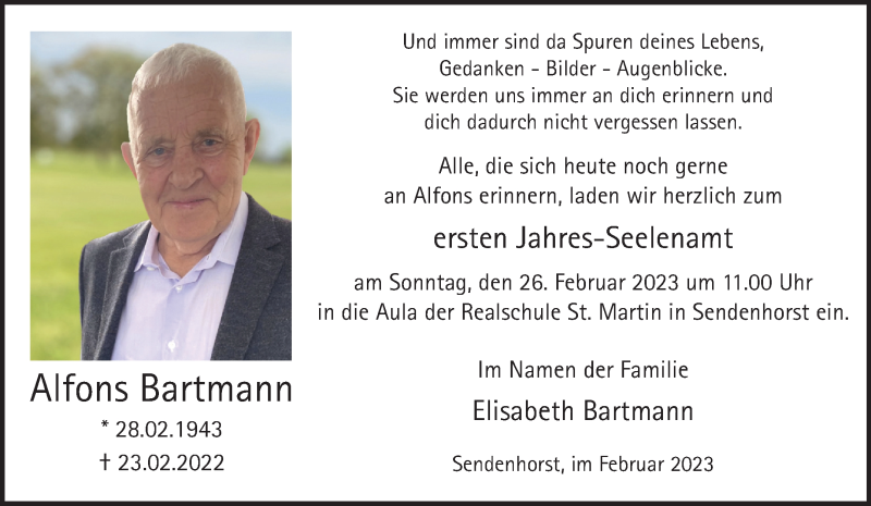 Hier finden Sie alle Traueranzeigen aus der Zeitung, die bisher für Alfons Bartmann erschienen sind. Weitere Traueranzeigen, die in der Zeitung erscheinen, werden hier ebenfalls aufgelistet