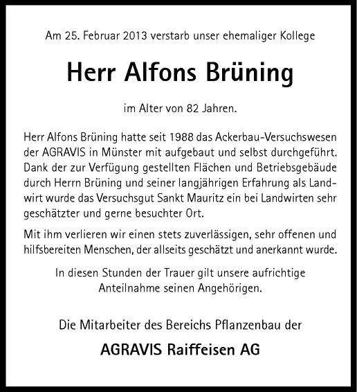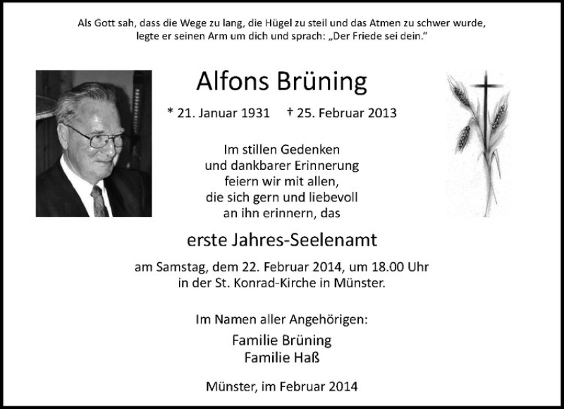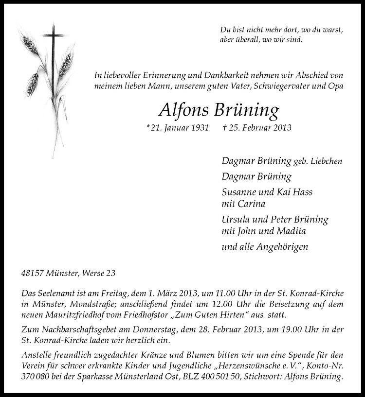 Hier finden Sie alle Traueranzeigen aus der Zeitung, die bisher für Alfons Brüning erschienen sind. Weitere Traueranzeigen, die in der Zeitung erscheinen, werden hier ebenfalls aufgelistet