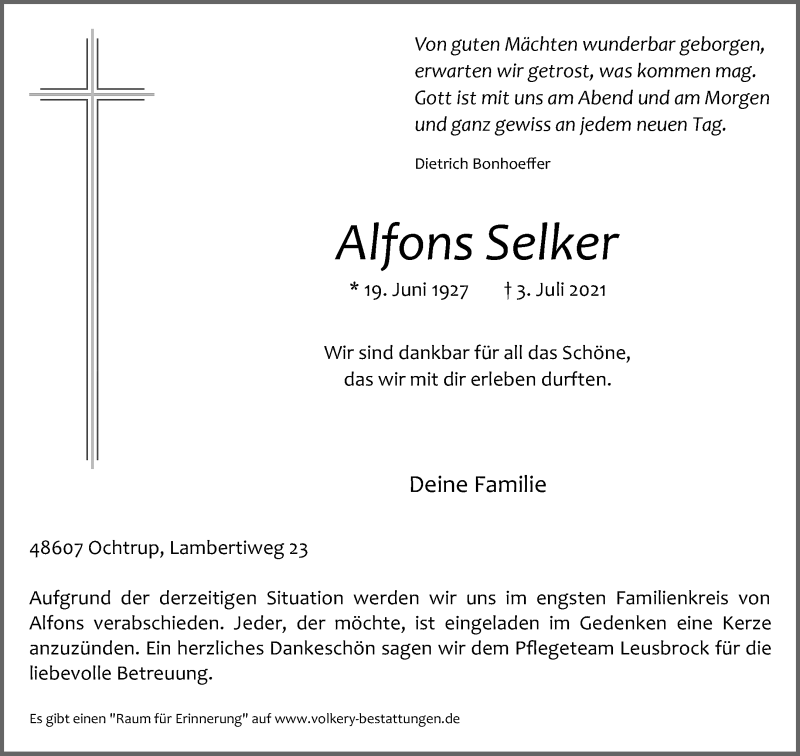 Hier finden Sie alle Traueranzeigen aus der Zeitung, die bisher für Alfons Selker erschienen sind. Weitere Traueranzeigen, die in der Zeitung erscheinen, werden hier ebenfalls aufgelistet